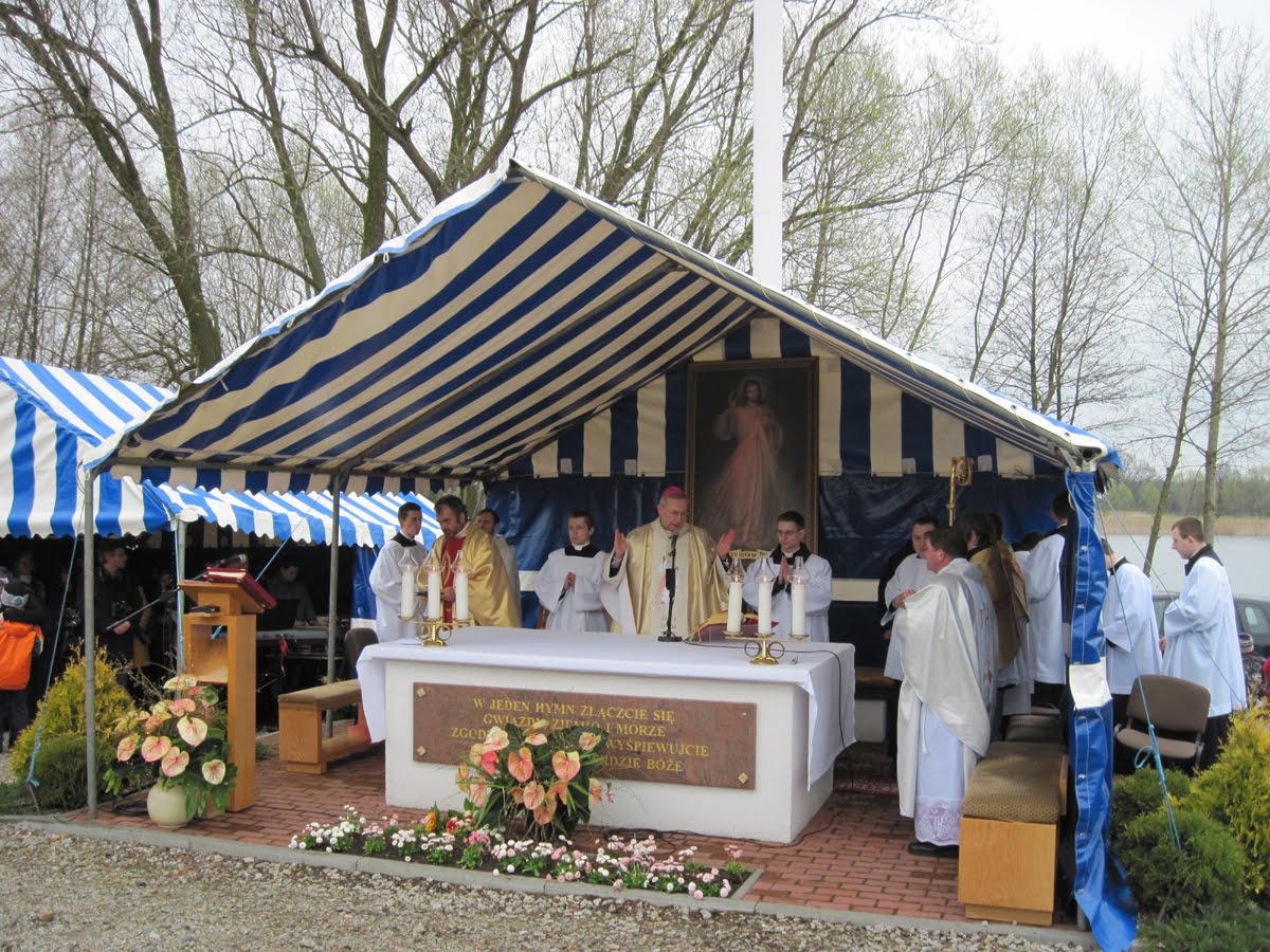 11 kwiecień 2010 roku, Polacy wstrząśnięci wczorajszą katastrofą lotniczą pod Smoleńskiem zbierają się na modlitwach w intencji ofiar. Ta Msza św. zaplanowana była dużo wcześniej. Odbyła się w szczególnym miejscu nad Małym jeziorem Kierskim, gdzie objawił się św. siostrze Faustynie Pan Jezus. Nie będzie w tym poście dużo o Prezydencie, będzie o Bożym Miłosierdziu. Uważam, że tego nam potrzeba modlitwy, modlitwy i jeszcze raz modlitwy, za tych co zginęli, za ich najbliższych ale i za nas samych. Tak, za nas samych musimy się modlić i błagać dla siebie i całego świata o miłosierdzie....Obok wierzba, z niewielką kapliczką, pamiętająca chyba jeszcze tamten czas objawień Jezusowych. Pod nią niewielki kamień, otoczak, jakich wiele na okolicznych polach. Jest tak skromna jak Ci którzy wczoraj zginęli i rozdarta jak nasz naród jest rozdarty. Płacze wierzba stara, jak tysiącletnia Polska, zwisającymi konarami i kroplami deszczu podobnie jak my, zgromadzeni na modlitwie. Obnażona przez jesień z liści, jest tak bezradna i goła jak my.