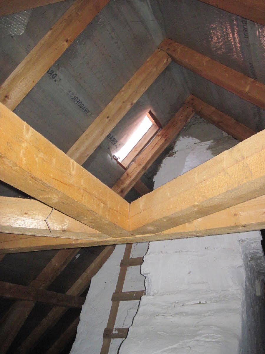 Zauroczony widokiem włączyłem lampę błyskową i zrobiłem podobne jak wyżej ujęcia więźby dachowej i świetlika pełnym świetle. Ostatnie zdjęcie to prawdziwe schody prowadzące w dół w kierunku uchylonych drzwi.